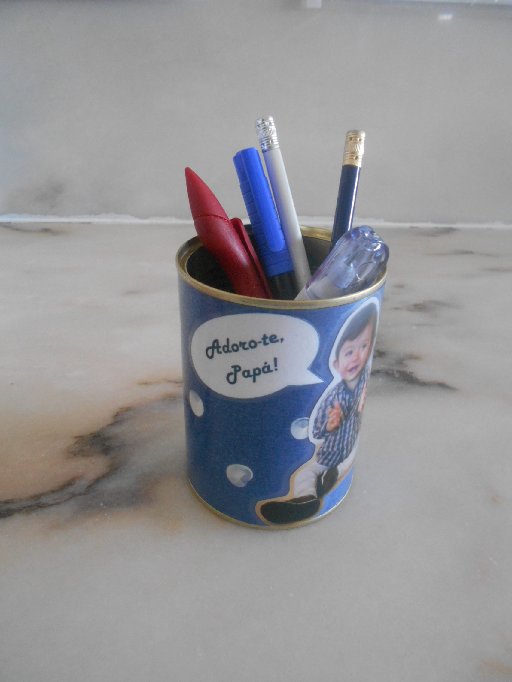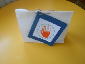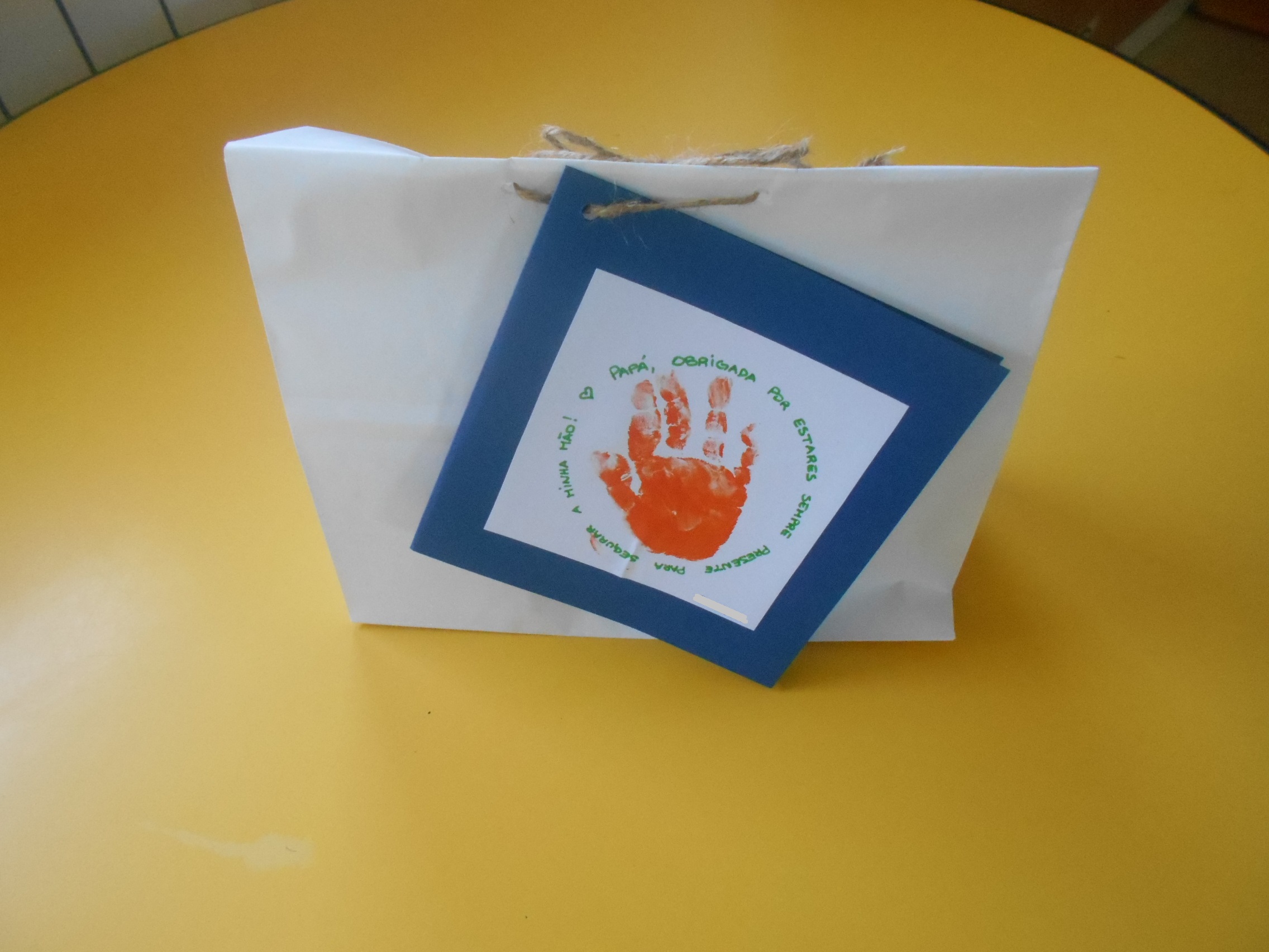 Depois disso, andámos muito ocupados a preparar-vos a prenda para o Dia do Pai… Nela carimbámos com o nosso dedo uma pequena cartolina azul, onde a Cláudia depois colou uma fotografia gira que nos tirou e transformou num porta-lápis para oferecer ao pai. Também carimbámos a nossa mão no postal, com a frase: “Papá, obrigada por estares sempre presente para segurar a minha mão!”.