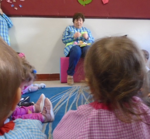 Ainda recebemos mais uma amiguinha que veio do berçário e somos 15 no total! Este mês quem nos contou a história na biblioteca foi a educadora Guida, foi uma história sobre os animais com janelas para abrir, no final mostrou-nos fantoches e cantamos algumas canções.