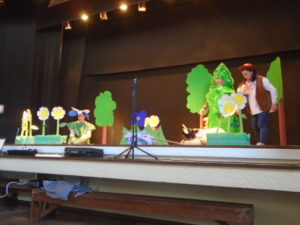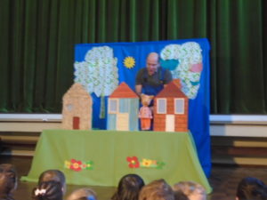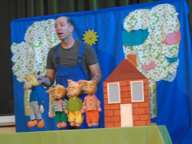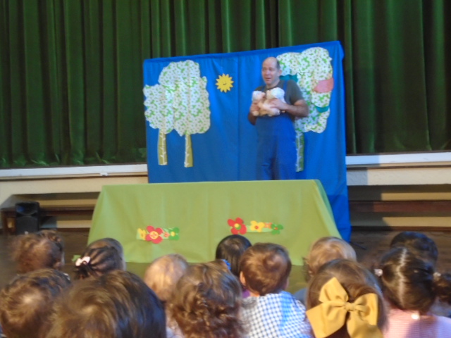 Tivemos também um teatro “Os 3 porquinhos e 1 só lobo”, gostamos muito, mas claro que alguns de nós ficamos um pouco assustados com o “senhor” que nos apresentou o teatro!