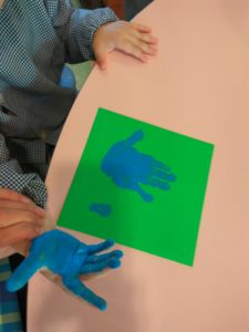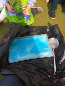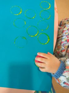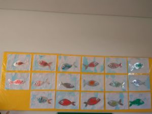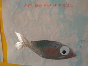 Para o fundo do mar, pintámos com bolinhas de sabão, que primeiramente experimentamos no exterior, mas com o vento, não resultou, tendo que fazer noutro dia em sala.