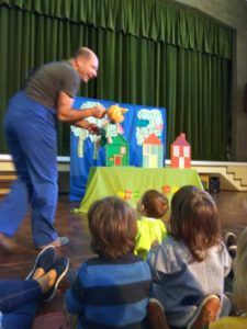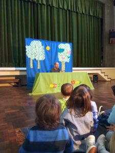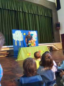 Fomos ao salão assistir a um teatro de marionetas intitulado “Três porquinhos e um só lobo!”, foi muito engraçado e dinâmico.