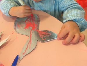 Começamos o mês de março com o carnaval que já mostramos aqui,mas como nos vestimos de tubarões aproveitamos, para falar mais um pouco sobre os animais que vivem no mar, o que comem, como é revestida a sua pele, e como se deslocam. Como havia uma criança que estava sempre a pedir um trabalhinho com prateado, fizemos um peixinho a nadar.