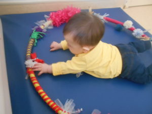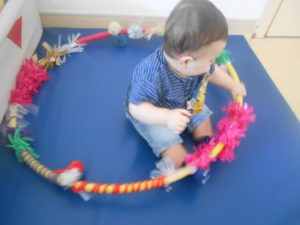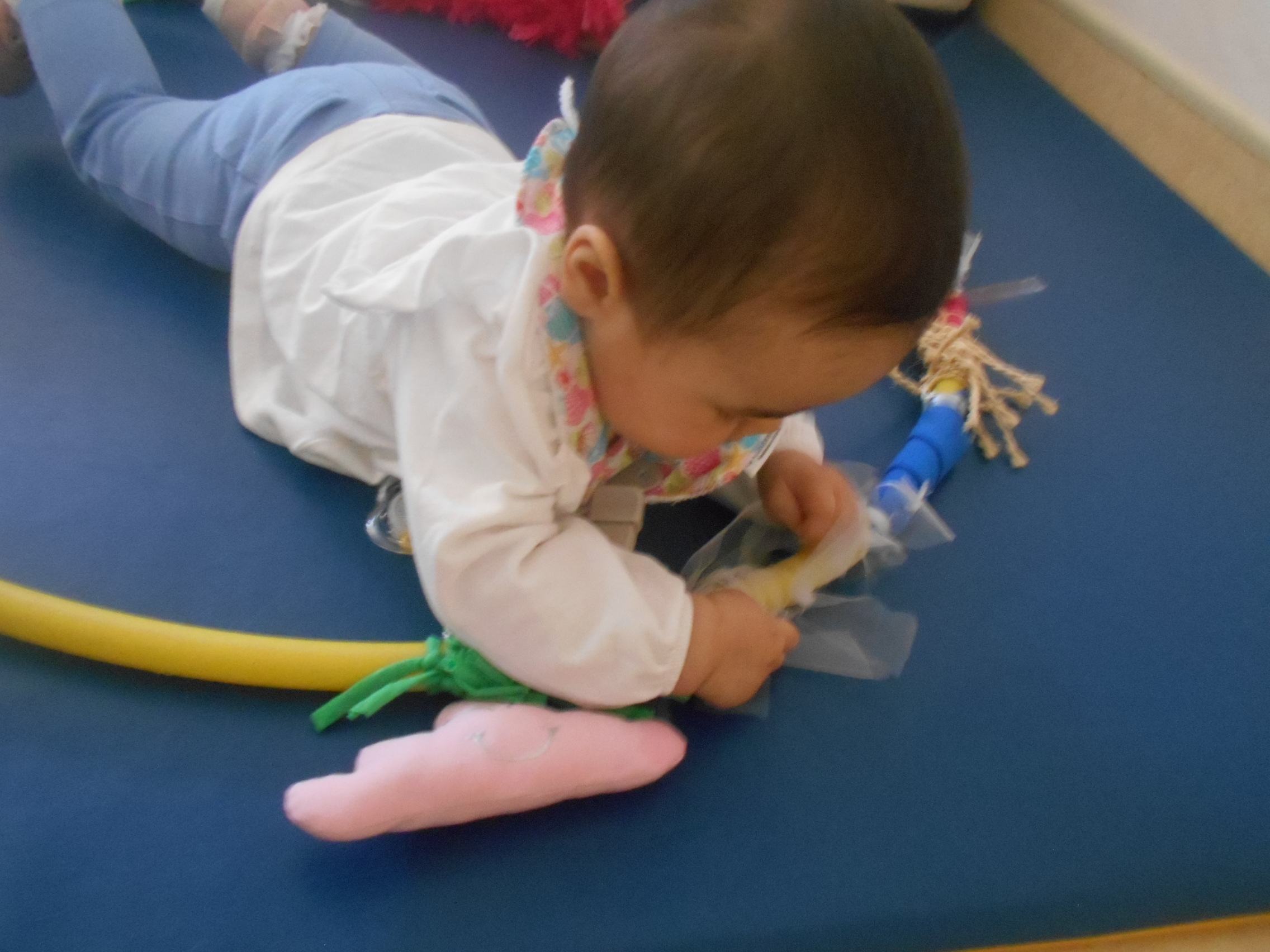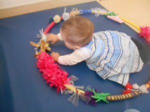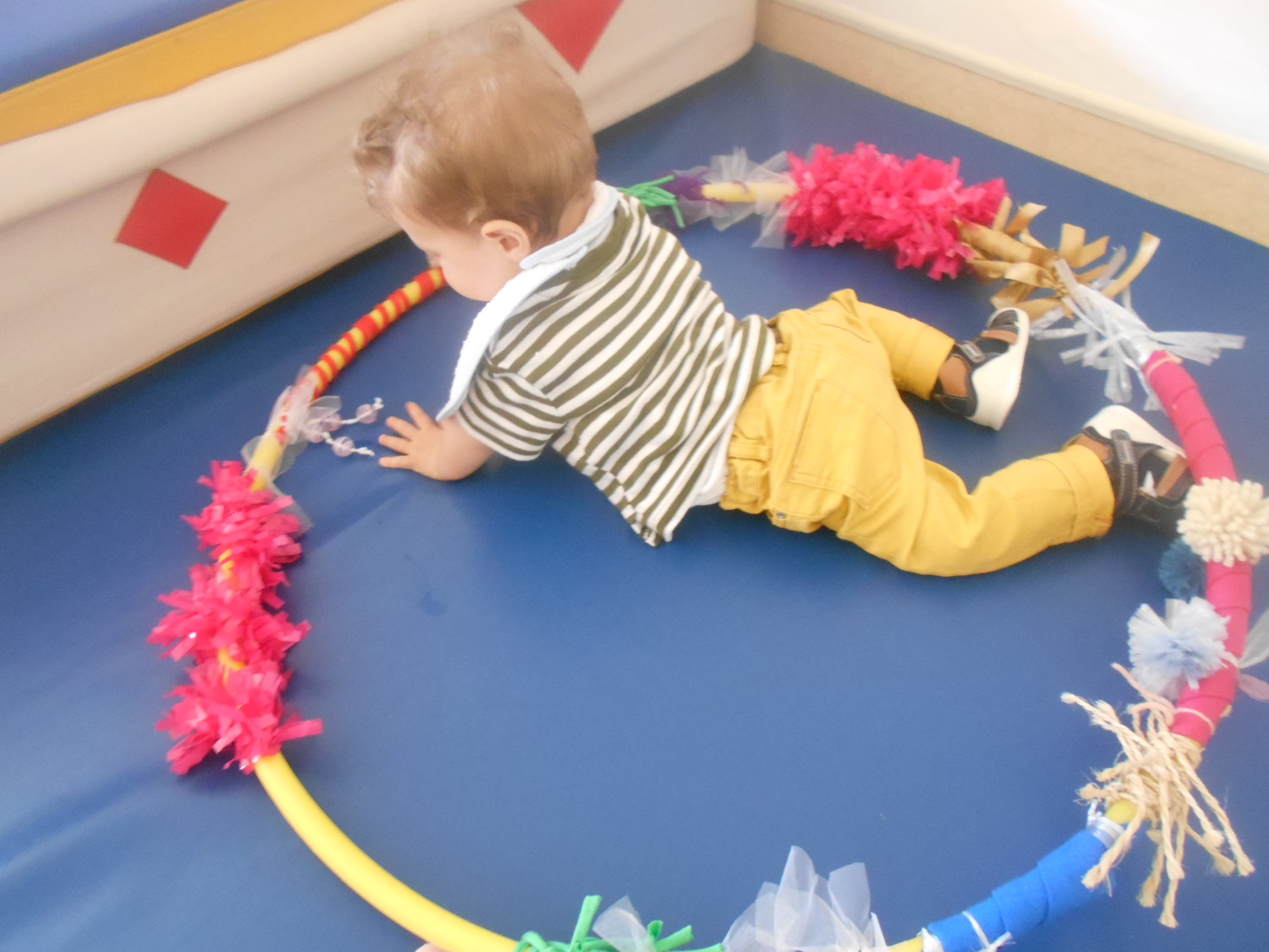 Por fim, a Cláudia enfeitou um arco com vários fios de texturas e cores diferentes e levou-o para a sala dos pequeninos. Foi uma animação, as cores apelativas fizeram com que todos os bebés quisessem mexer e sentir os diferentes materiais que enfeitavam o arco.