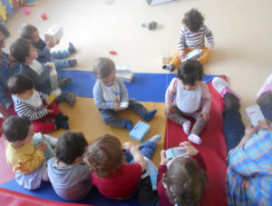 Depois, a Cláudia trouxe-nos muitas caixas de cartão vazias para nós explorarmos e foi uma animação, uns quiseram empilhar, outros abriram as caixas para ver se havia alguma coisa lá dentro, outros abanaram-nas, os mais pequeninos quiseram pô-las na boca… Foi muito giro!