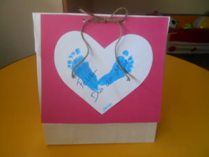 Para começar, temos a prenda do Dia da Mãe para vos mostrar, uma bela jarra pintada com os nossos dedos e com uma foto nossa (mas essa parte não pode vir para aqui). Também fizemos um postal em forma de coração com os nossos pés.