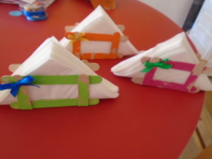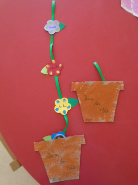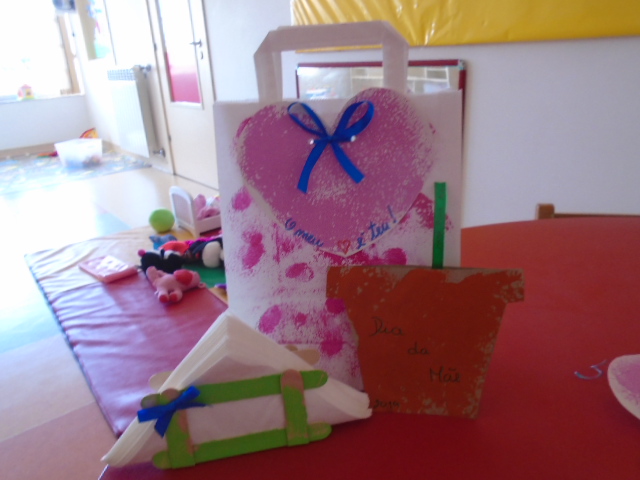 Lembram-se da surpresa que estávamos a preparar? Era uma prenda para as nossas mamãs! Fizemos, um porta-guardanapos com espátulas de madeira pintadas por nós. Fizemos também um postal em forma de vaso e de lá de dentro saiam umas flores bonitas onde uma delas tinha a nossa fotografia e ainda decoramos o saco com um coração. Esperamos que elas tenham gostado!