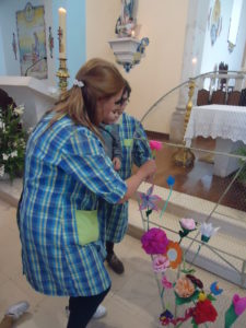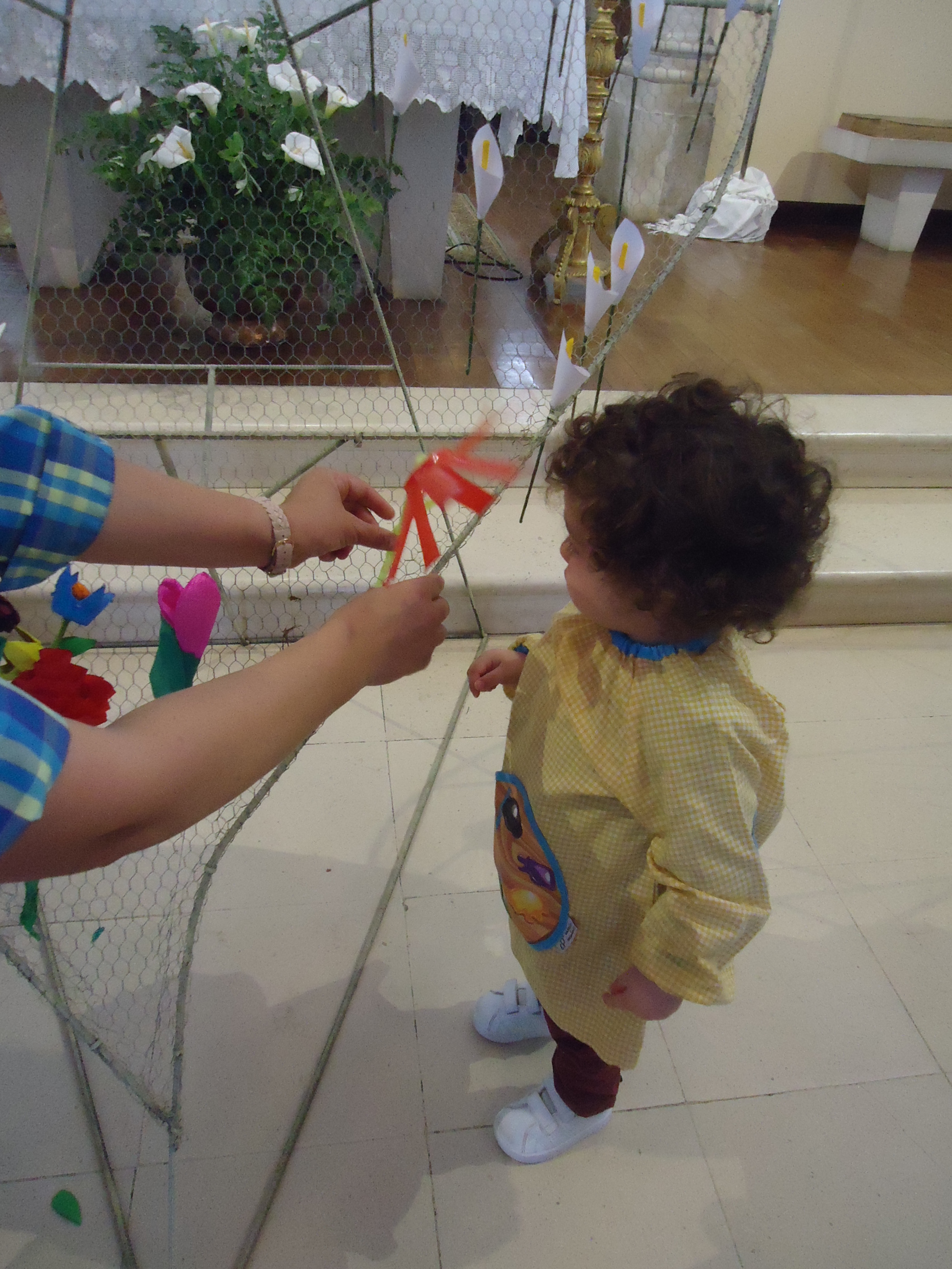 No mês de Maio celebramos o “Dia da Mãe” na nossa instituição de uma forma muito afectiva e calorosa, pedimos antecipadamente a colaboração das famílias para a construção de uma flor (com materiais reciclados) para que cada criança fosse colocar num Coração “gigante” (construído com arame) a sua flor….e assim foi. Saímos em “ comboio” e dirigimo-nos à igreja onde já estavam todas as crianças do pré-escolar e os idosos do Lar Amelia Madail. Com a minha ajuda cada criança colocou a sua flor e depois cantamos todos a N. Senhora, foi um momento muito sentido.