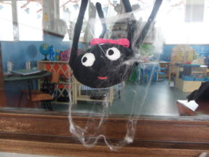 Olá amiguinhos! Cá estamos nós, desta vez para contar as novidades do mês de Novembro… aliás, ainda no final do mês de outubro tivemos na escolinha a festa do halloween… quando chegámos na manhã do dia 31 de outubro, tivemos uma surpresa assustadora…. Teias de aranha, vassouras de bruxa e uma aranha enoooorrrmee! Abanámos o esqueleto num baile de halloween e foi muito divertido.