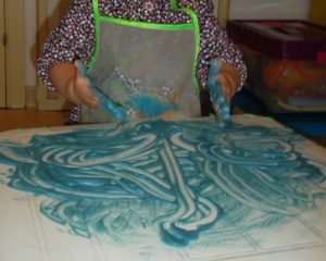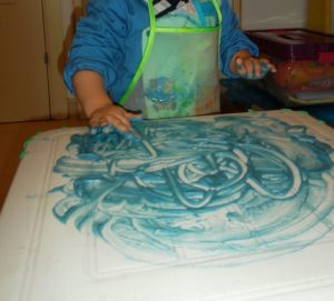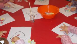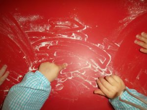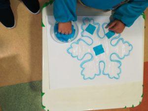 Aproveitando a chegada do Inverno, começámos a aprender a conhecer e a identificar a cor azul e divertimo-nos a explorar massa de farinha azul, e a pintar com o dedo na farinha espalhada na mesa. Ainda somos muito pequeninos, mas já gostamos muito de fazer atividades em conjunto na mesa com os nossos amigos.
