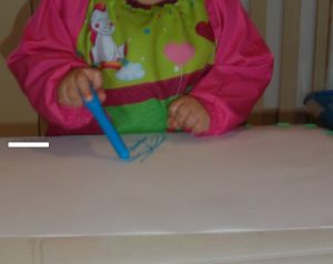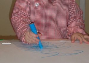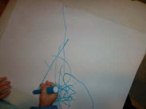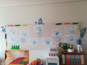 Com uns lápis de cera azul, rabiscámos nas nossas folhas brancas, as nossas obras de arte, que decoraram o nosso placar e tornaram a nossa sala mais bonita.