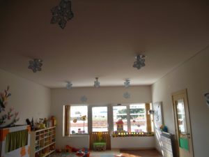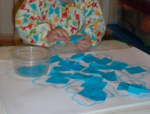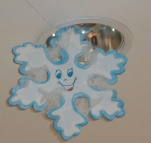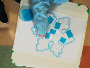 Iniciámos a temática do Inverno e com os nossos pedacinhos azuis fizemos colagem em flocos de neve para a decoração do teto da nossa sala, que ficou bem gira.