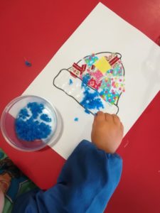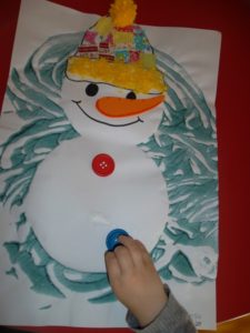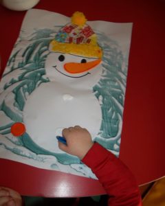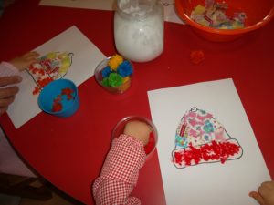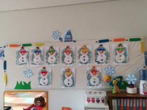 A Ana Paula desenhou uns gorros, e na nossa mesa de atividades fizemos colagem com pedacinhos de tecido e lã para construirmos os nossos bonecos de neve, que na nossa digitinta decoraram o nosso placar do Inverno, que ficou alegre e colorido.