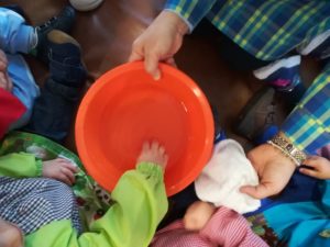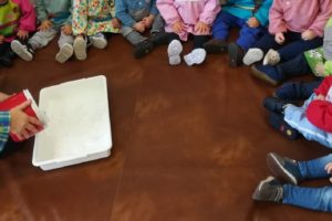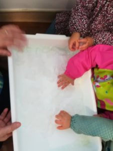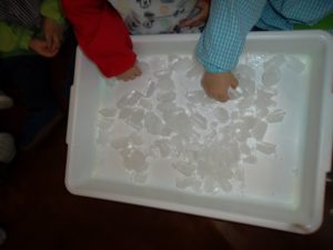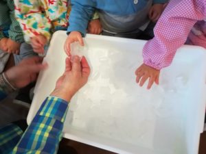 No nosso espaço da conversa depois de ouvimos uma história do rato Renato em que se fala do frio e da neve tivemos uma atividade sensorial aonde explorámos gelo. Todos se entusiasmaram com a atividade de ter os cubos na mão e sentir o frio. No final lavámos as mãos com água morninha, que todos adoraram sentir.