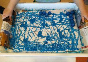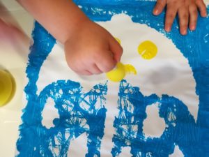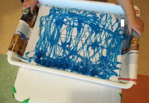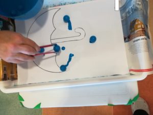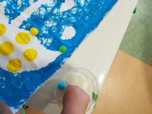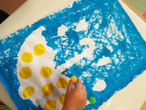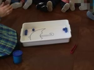 Pintámos guarda-chuvas com os nossos berlindes azuis, que é uma atividade que nos diverte.