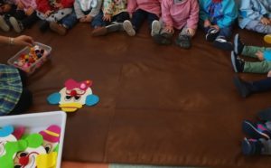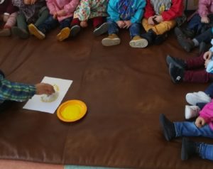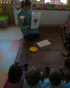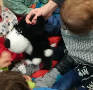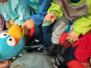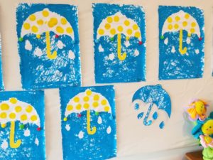 O Inverno ainda continua connosco e na nossa manta da conversa depois de ouvirmos uma divertida história falámos da chuva, de guarda chuvas e da cor azul, que continuamos a explorar nas nossas atividades e que a maioria de nós já identifica e alguns já a nomeiam com entusiasmo.
