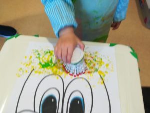 Retirámos os nossos recortes do guarda-chuva da folha, pintámos com os nossos carimbos de esponja com a cor amarela e colámos alguns pompons coloridos. O nosso placar ficou bonito e nós divertimo-nos a realizar esta atividade.