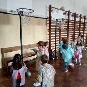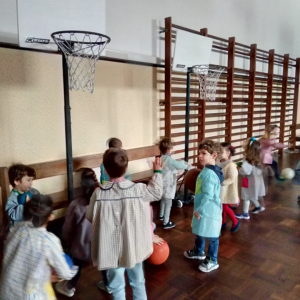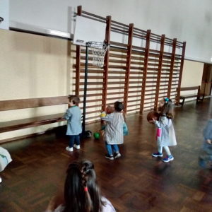 Brincámos muito no salão com as bolas e com as tabelas de basquetebol. Gostámos muito é muito divertido!