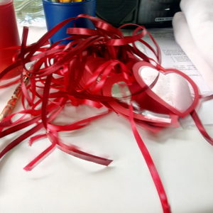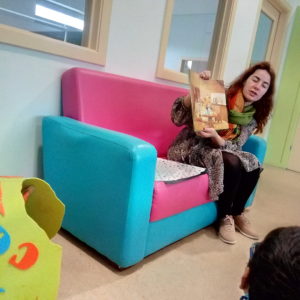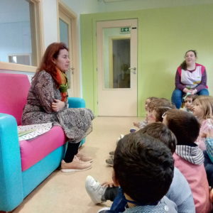 A mãe da Flávia veio à nossa biblioteca contar uma história chamada “Desculpa”. Nós já a conhecíamos, mas é sempre diferente contada por outra pessoa. Ofereceu-nos depois corações para pendurarmos no pescoço, pois era dia da amizade.
