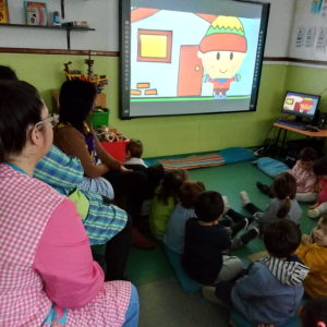 Convidámos também os meninos da sala da educadora Denise para vir à sala ouvir uma história e experimentar o nosso quadro interativo. Eles gostaram muito!