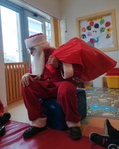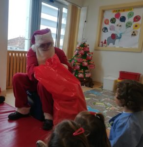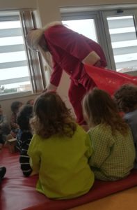 Nesse mesmo dia da parte da manhã recebemos a tão esperada visita, o Pai Natal! Gostámos muito de o receber, ele trouxe um presente para cada um. Alguns de nós até lhe deu um abraço e um beijinho.