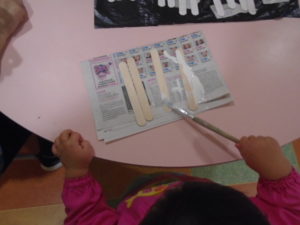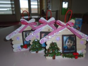 Por fim fizemos uma prendinha para levar para casa, pintamos algumas espátulas que a Denise transformou numa casinha e colou a nossa fotografia colou mais alguns enfeites natal e ficou muito bonita. O saco para levar o presente também foi pintado por nós.