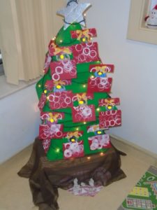 Depois a Denise foi buscar uma árvore de natal para decorarmos e lá penduramos uns presentes pintados por nós com a nossa fotografia a sair de cada caixa. Ela também pôs um presépio junto à árvore. Nós sabemos bem como se chamam as figuras, o José, a Maria e o menino Jesus.